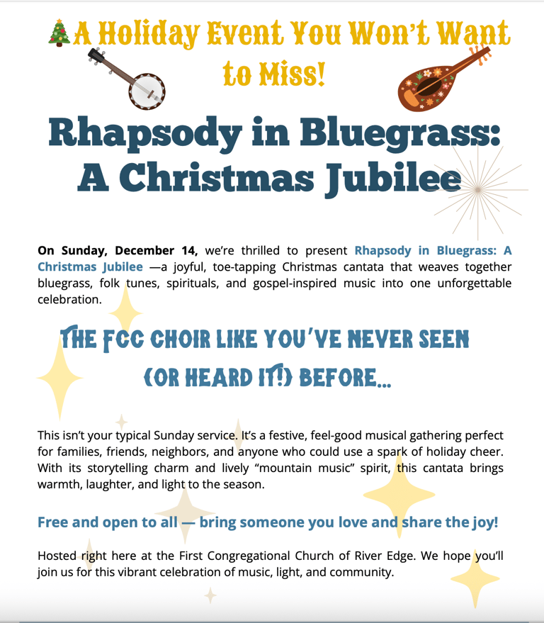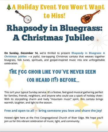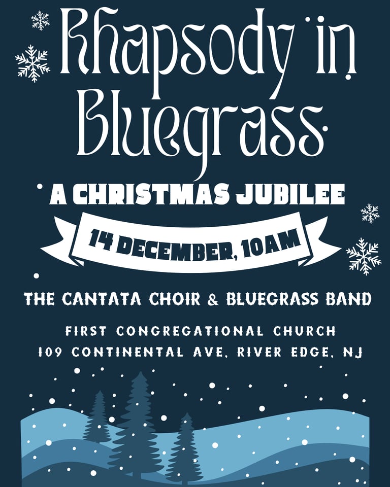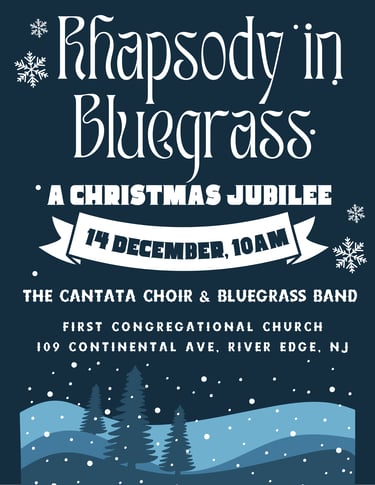 December 14 Christmas Jubilee "Rhapsody in Blue Grass" at 10 AM. Presented by Cantata Choir with a live band