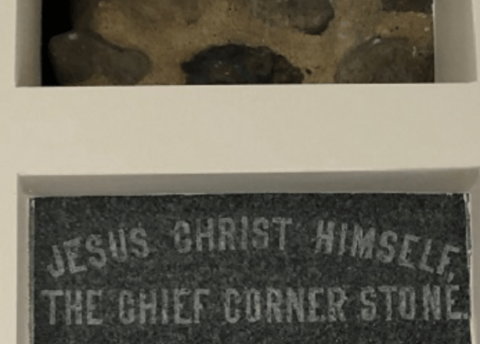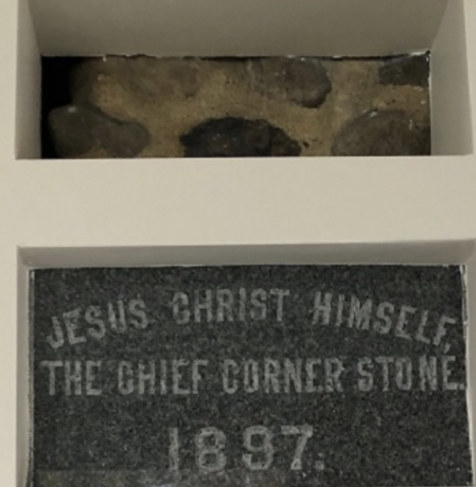 The Sabbath Day School, a small white clapboard building was erected in 1846, and measured 25' long and 17' wide. Some 50 years later, the River Edge Chapel Association built a new church on this same land. Stones from the original building were incorporated into the new stone church building Some of these stones can be seen in the courtyard and the interior wall of the Pastor's office.